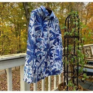 - Beautiful vibrant blue and white tropical botanical print button front collared blouse top by Talbots