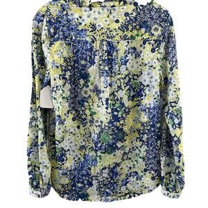 Talbots Blue Yellow White Floral Print LS Womens Top Size XS Ruffle Trim