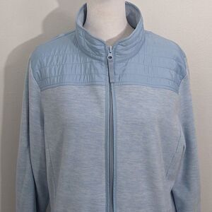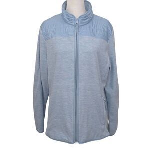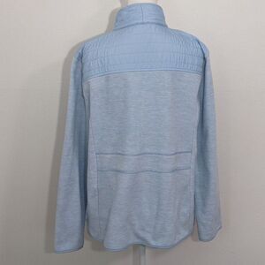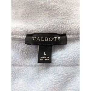 Talbots long sleeve jacket features zip-up front and two pockets with zippers. Fabric is a soft light blue fleece except for quilted shoulders. Excellent condition!