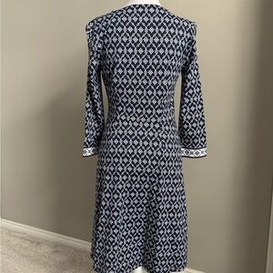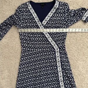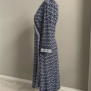 This stylish A-line dress features a flattering V-neckline , making it perfect for casual or work occasions. The wrap design enhances the silhouette while the blue and white color scheme adds a fresh touch.