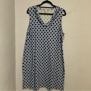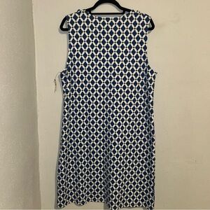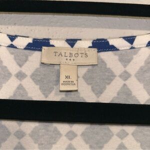 Chic top featuring a blue and white geometric design. Ideal for versatile styling.