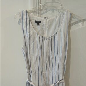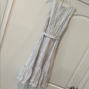 Elegant maxi dress with blue and white stripes. Sleeveless design. Features a tie waist for a flattering fit.