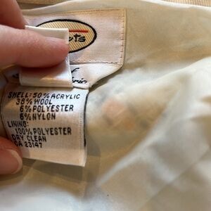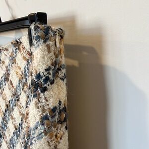 Off white / cream wool blend skirt in boucle tweed texture. Has hints of blue and camel tan. Excellent used condition with no flaws.