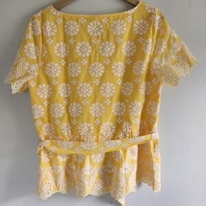 Talbots Bright Yellow Floral Embroidered Short Sleeve Top With Peplum Size 12