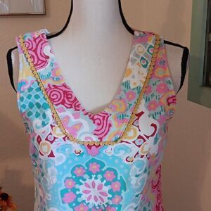 This dress smiles. Yellow trim around neckline. Bold graphics. Size S/8 measures 38 at chest, 35 at waist, 40 at hips, 37 long from shoulder to hem. No content tags, but this is a cotton/elastane blend. There is some stretch. Bright and sunny.