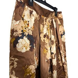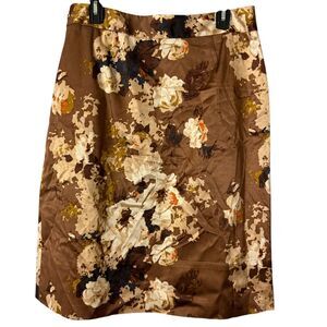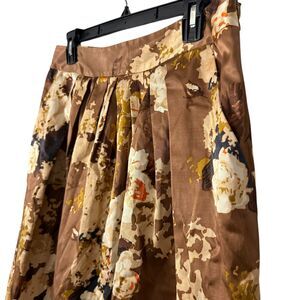 Elegant A-line skirt with floral pattern. Features a blend of brown and cream tones. Perfect for any occasion.