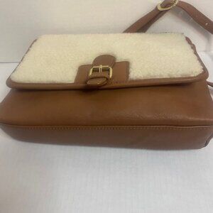 Elevate your winter wardrobe with the 'must-have' texture of the season. This bag blends creamy, luxurious fleece with a timeless, structured saddle design and buckle detail, making a statement that's both current and classic