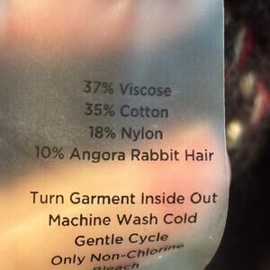 Viscose, nylon, cotton and Angora. Thick, heavier knit fabric.