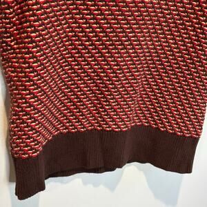 Brown, tan and red patterned sweater vest. Brown ribbed trim.