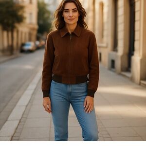 Talbots Chocolate Brown Suede Leather Bomber Style Jacket. Full zippered front, with 2 zippered pockets. Ribbed knit hem and cuffs. Buttery soft and silky suede leather, fully lined. 100% leather. Size 14p. Originally $399. Save money and have a great jacket for fall!