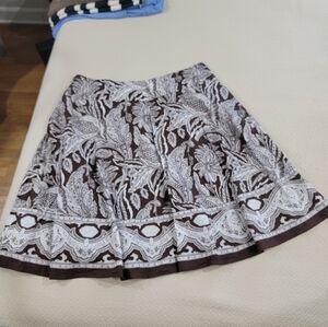 Pretty skirt featuring a brown and white floral pattern. 100% Cotton. Lined. Side zipper and button closure.