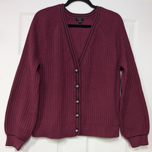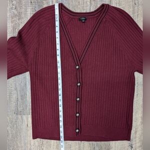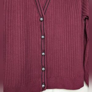 Elegant ribbed cardigan with button front. V-neck design. Perfect for layering.