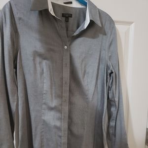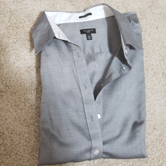 Grey button down, that has great material and in great condition. Maybe worn 3x. It can be worn with most anything to be dressed up or down and great for work.