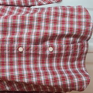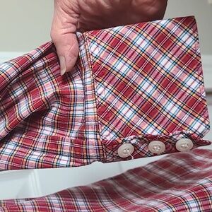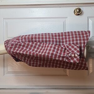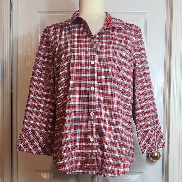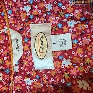 Long 3 Button Sleeves, Collared Neckline, Buttons Down, Stretchy Material, Burgandy and Blue Plaid, Inside of Collar in a Contrasting Floral Print, Size Large.