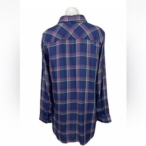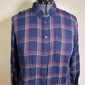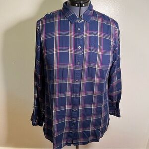 Great condition. Talbots. Button down shirt. Long sleeve. Blue with pink, light blue, orange and white plaid pattern. Chest pocket. Style ID4976. Size large. 100% rayon. Pit to pit laying flat 21” shoulder to hem 28” Sleeve (seam to hem) 23”. All measurements are approximate and taken lying flat. Smoke free home. No trades, offers welcome.