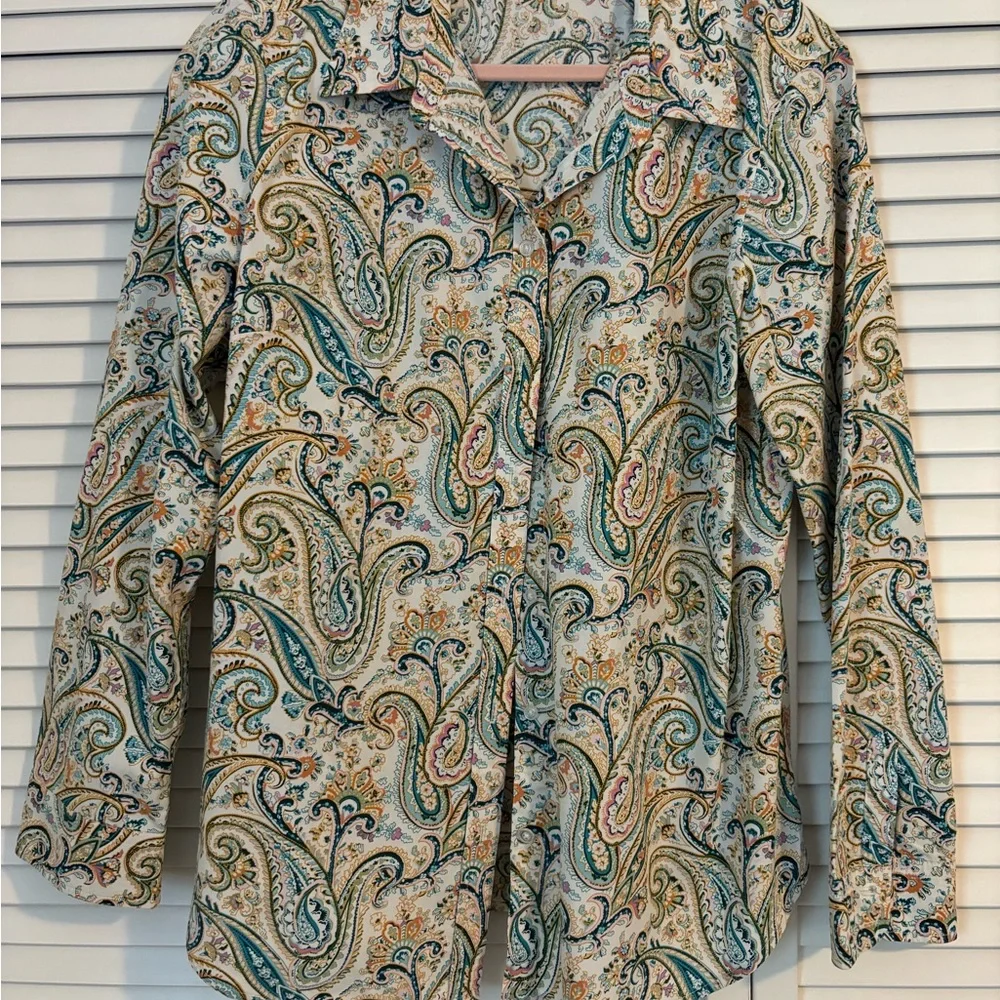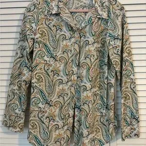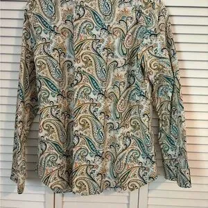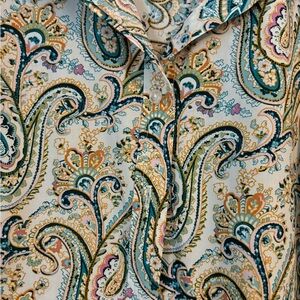 Paisley print in multiple colors of blues, greens, teal, golds and pinks
