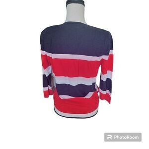 Cute, lightweight, striped button up cardigan with 3/4 sleeves. Colors are red, white, blue and pink. Perfect for cool summer nights. In excellent pre-owned condition. Size M. Fits perfectly on size 6 mannequin.