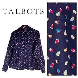 Talbots Button Up Navy All Over Acorn Print Shirt Blouse Teachercore Size P
