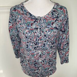 Used condition no visible flaws cardigan size Large petite. showcases a delightful floral and paisley print, complemented by 3/4 length sleeves for a sophisticated look. Ideal for both casual and formal settings, it offers a relaxed fit for all-day comfort.
