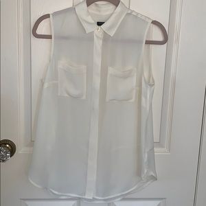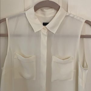 A sheer creme colored Talbots tank top. It is a loose shirt that buttons up. There are two usable pockets in the front of the shirt. There are no tears, pulls or stains.