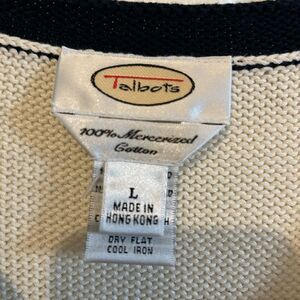 Talbots 100% Mercerized Cotton, Button Front, Ivory with Black Cardigan, Pockets, Sweater Size Large
