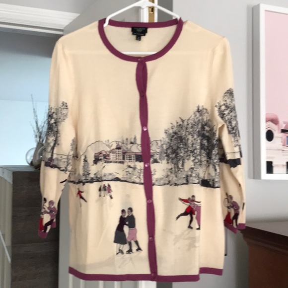 Never wore Talbots Cardigan Size MP Color purple trim with cream background Adorable top for the winter months!!
