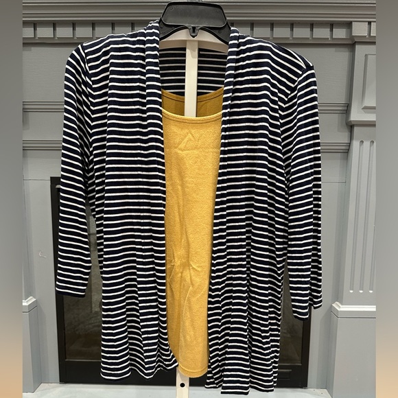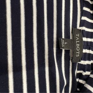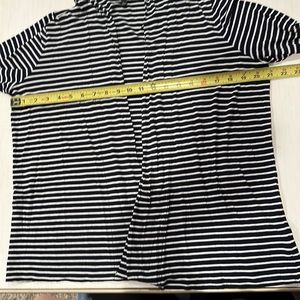 Super cute navy and white cardigan is in great condition. It is a size large. I am a large and it’s a little tight in the arms for me. Could fit as a medium as well. It measures 21 inches pit to pit.