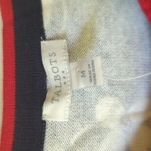 Navy blue cardigan with white flowers and a red stripe around neckline. Button up. NWT. Talbots brand. Size M. One flower has a slice that stain- please see pics.