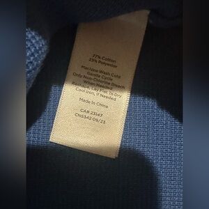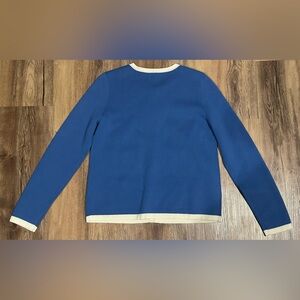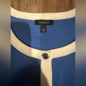 Talbots button-up tipped cardigan in blue with white trim.
