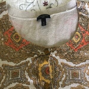 Classy work or special occasion appropriate button up cardigan sweater. In a stylish medallion print with metallic gold accents. Beautiful colors for fall!