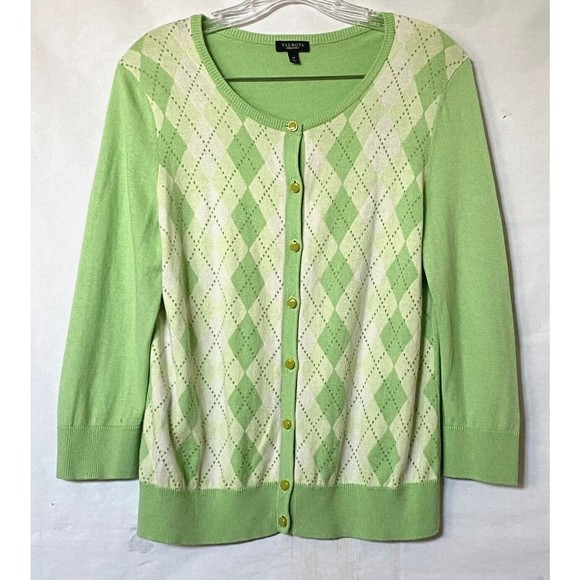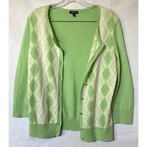 Talbots Cardigan Women M Lime Green Yellow Argyle Cotton Silk Blend 3/4 Sleeve