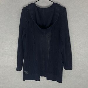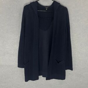 Talbots Cardigan Women Petite Sz M Navy Blue 100% Cotton Knit Hooded Open Front