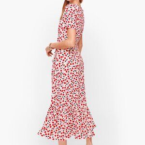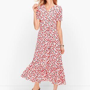 This Talbots faux wrap dress features a bold, feminine floral print in vibrant red, pink, and black on a soft white background. The silhouette is flattering and effortless with a V-neckline, short sleeves, and a tiered cascading skirt. Though it looks like a true wrap, it zips invisibly in the back for easy wear.