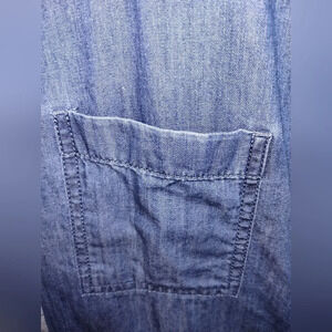 This size 6 Talbots chambray button-down dress with denim pockets is perfect for summer, measuring 16" at the waist, 17" armpit to armpit, and 41" in length. It is in good used condition with minor fading in spots, featuring two pockets for added convenience.