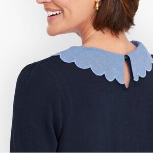Great condition, minor wear. Talbots. Chambray collar sweatshirt. Navy blue color with chambray blue neckline. Our soft sweatshirt featuring standout details. With a chic chambray crewneck collar and a ribbed hem.