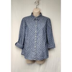 Talbots Chambray Shirt Blue White Polka Dots Roll-Tab Long Sleeve Button Up Size 10.