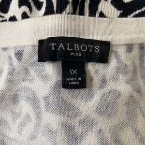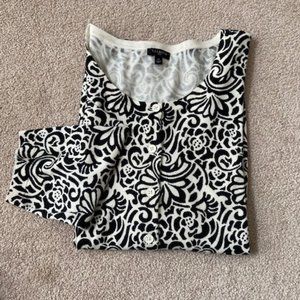 Charming cardigan with a black and white floral pattern. Sleeves are 3/4 length. This is a button-up style that can be worn buttoned up or open with a shell underneath.