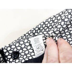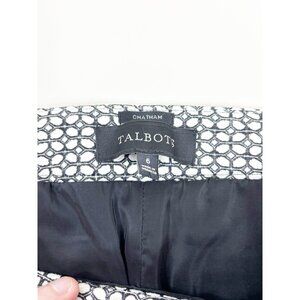 The Talbots Chatham pants in size 6 feature a stylish geometric pattern with a slit ankle detail and a zip side closure. Made from a comfortable knit fabric blend of spandex, rayon, and cotton, these pants are perfect for various occasions including travel, parties, casual outings, workwear, and business meetings. The tapered leg style and mid-rise waist offer a flattering silhouette, while the black and white color scheme adds a classic touch to the overall design. Easy to care for with machine washable instructions, these pants are a versatile and chic addition to any woman's wardrobe.