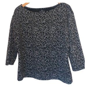 This top from Talbots is super soft and cozy, and trendy with the cheetah leopard animal print. The sleeves are three-quarter links so perfect for the fall winter transition. The right shoulder has a zipper detail. Size large and in wonderful preowned condition.