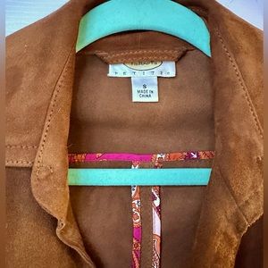 Like new! Super cute jacket! 100% Suede- (soft) Chestnut color- 4 buttons- buttons on pockets and sleeves- paisley piping on the inside. Size small. Please ask questions before purchasing this item. All sales are final. 🫶🏻