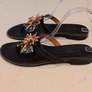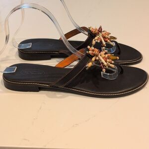 Talbots Chocolate Brown Leather Thong Flat Sandals with Beaded Sunburst.