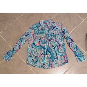 The Talbots Classic Cotton Shirt in size M is a stylish and versatile addition to any woman's wardrobe. This long-sleeve button-up shirt features a paisley pattern in a vibrant multicolor design, perfect for adding a touch of flair to any outfit. Made of soft cotton material, this shirt is comfortable to wear and has a classic collared neckline with a button closure, making it a timeless piece that can be dressed up or down for any occasion.