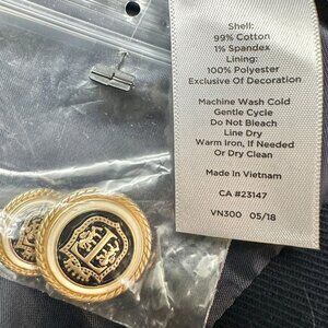 This tailored navy jacket offers a polished look with its button-front design and structured fit. Crafted from cotton and spandex, it provides comfort and ease of movement. The jacket's classic style makes it suitable for professional or casual settings.