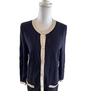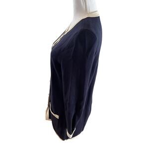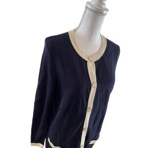Talbots Classic Long Cardigan Sweater Navy Blue Cream, Size MP. Good preowned condition, cotton rayon blend. Enamel Button Front, Patch Pockets, cream trim