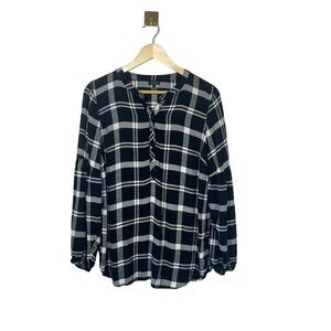 Talbots Collarless Plaid Puff Sleeve Tunic Blouse in Black/White Size M