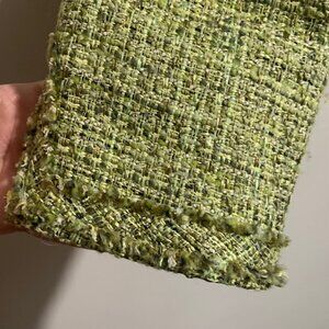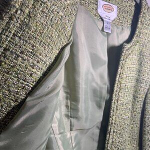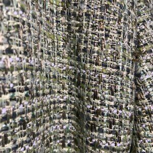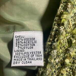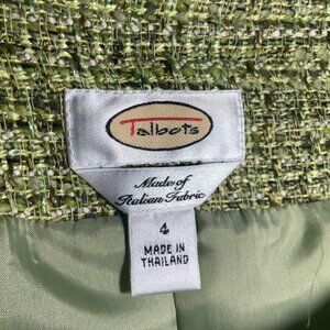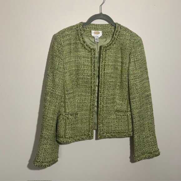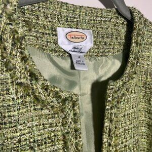Add a touch of timeless sophistication to your wardrobe with this stunning Talbots tweed blazer! This collarless jacket features a beautiful multi-tonal green textured weave with elegant eyelash fringe detailing along the edges. Crafted from a premium Italian fabric blend, it offers a tailored silhouette that is perfect for professional settings or elevated casual wear.