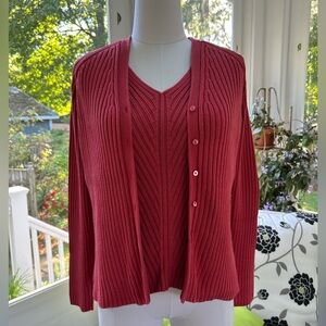 Talbots Collection 2-piece salmon color sweater set with ribbing pattern throughout. Sleeveless v-neck shell and long sleeve v-neck cardigan with 7 same colored buttons.
