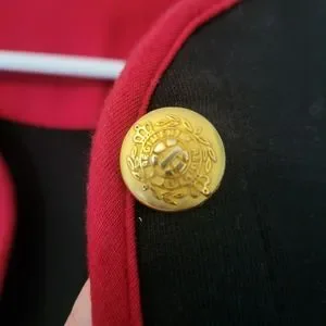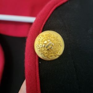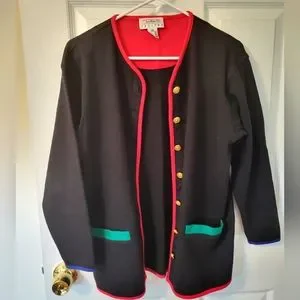 This adorable jacket has so much character! Black jacket, with basic color block trim, fun gold buttons. Size Petite Small.