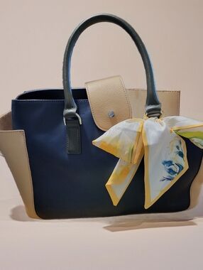 Talbot Colorblock Satchel. Beautiful Cream, Navy , and olive green. Three compartments. Silver era hardware. Colorful scarf. EuC. GORGEOUS colors. Elegant bag.