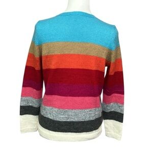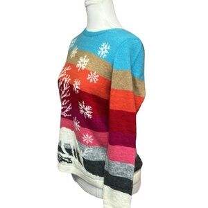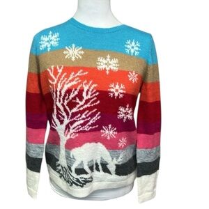 Stay cozy and stylish with this vibrant sweater featuring a winter scene. The colorful stripes add a playful touch to your wardrobe. Perfect for chilly days.